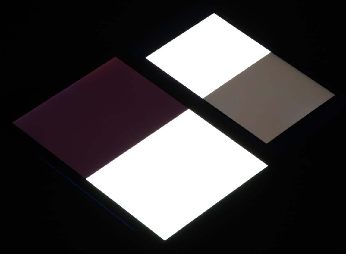 Яркость под углом у экранов уменьшилась, но у Archos Diamond Plus экран под этим углом все же немного темнее (яркость по фотографиям 219 против 234 у Nexus 7). Черное поле при отклонении по диагонали высветляется сильно и приобретает легкий красноватый или синеватый оттенок. Фотографии ниже это демонстрируют (яркость белых участков в перпендикулярном плоскости экранов направлении одинаковая!):