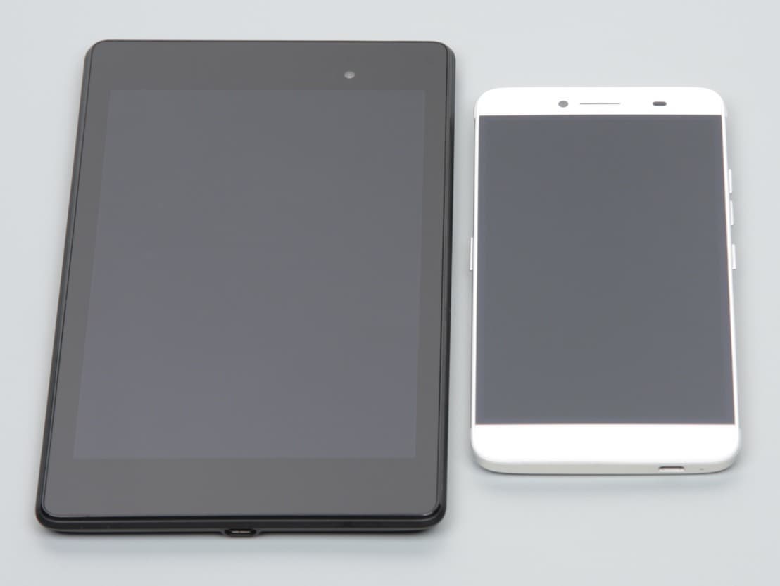 Лицевая поверхность экрана выполнена в виде стеклянной пластины с зеркально-гладкой поверхностью, устойчивой к появлению царапин. Судя по отражению объектов антибликовые свойства экрана лучше, чем у экрана Google Nexus 7 (2013) (далее просто Nexus 7). Для наглядности приведем фотографию, на которой в выключенных экранах отражается белая поверхность (слева — Nexus 7, справа — Archos Diamond Plus, далее их можно различать по размеру):