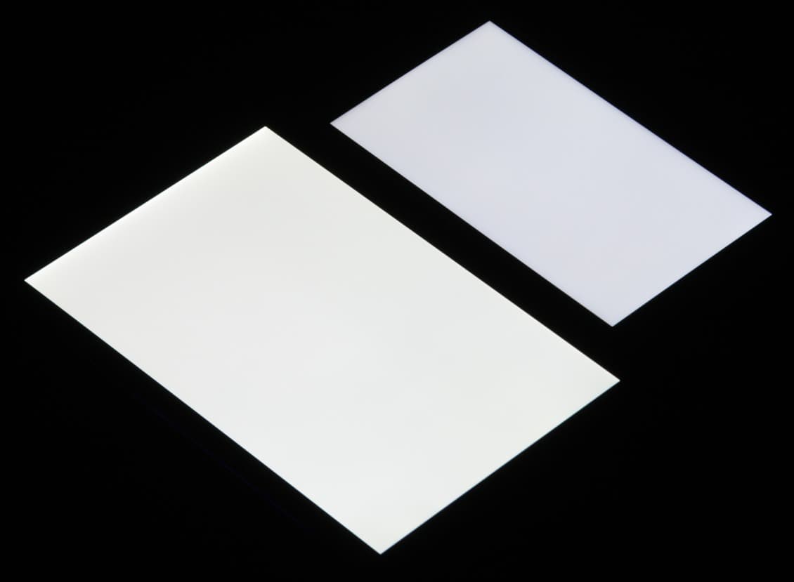При перпендикулярном взгляде равномерность черного поля неидеальная, так как местами ближе к краю яркость черного заметно повышается, также сквозь щели корпуса просвечивают светодиоды подсветки, что смотрится не очень хорошо: