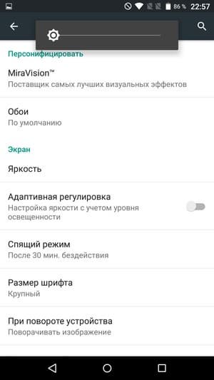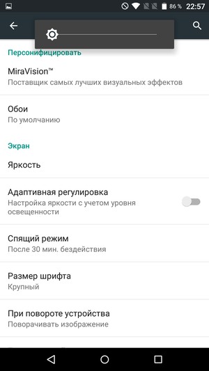 При ручном управлении яркостью и при выводе белого поля во весь экран максимальное значение яркости составило около 520 кд/м², минимальное — 150 кд/м². Максимальная яркость очень высокая, и, учитывая отличные антибликовые свойства, читаемость даже в солнечный день вне помещения должна быть на хорошем уровне. Для условий полной темноты минимальная яркость будет выше комфортного значения, но не все так плохо — см. ниже. В наличие автоматическая регулировка яркости по датчику освещенности (он находится правее прорези фронтального громкоговорителя). В автоматическом режиме при изменении внешних условий освещенности яркость экрана как повышается, так и понижается. Работа этой функции зависит от положения ползунка регулировки яркости. Если он на 100%, то в полной темноте функция автоматической подстройки яркости уменьшает яркость до 200 кд/м² (очень много), в условиях освещенного искусственным светом офиса (около 400 лк) яркость повышается до 415 кд/м² (тоже много), в очень ярком окружении (соответствует освещению ясным днем вне помещения, но без прямого солнечного света — 20000 лк или немного больше) устанавливается на 540 кд/м² (то, что нужно). Ползунок яркости на 50% — значения следующие: 30, 230 и 540 кд/м² (подходящие величины), на 0% — 10, 40 и 540 кд/м² (среднее значение уж слишком низкое). Получается, что функция автоподстройки яркости работает адекватно, и есть какая-то возможность подстроить характер изменения яркости под требования пользователя. На любом уровне яркости значимой модуляции подсветки нет, поэтому нет и никакого мерцания экрана.