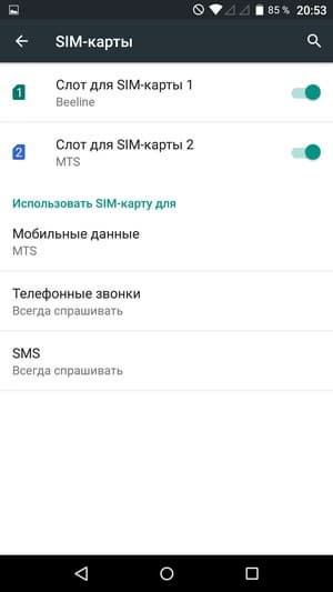 Смартфон поддерживает работу с двумя SIM-картами. При осуществлении вызова можно выбрать желаемую карту, также можно заранее какую-то из SIM-карт назначить основной для организации голосовых звонков или отправки SMS-сообщений. С сетями 3G/4G может работать SIM-карта в любом слоте, однако одновременно в этом режиме может функционировать лишь одна из карт. Для смены назначений слотов карточки менять местами не требуется — это можно сделать прямо из меню телефона. Работа с двумя SIM-картами организована по привычному стандарту Dual SIM Dual Standby, когда обе карты могут находиться в активном режиме ожидания, но одновременно работать не могут — радиомодуль здесь только один.