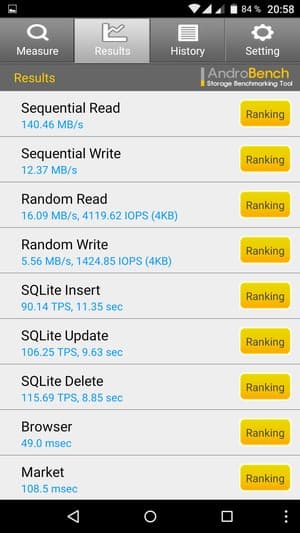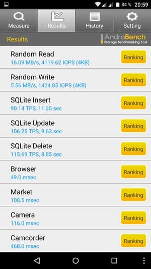 Результаты теста AndroBench на скорость работы с памятью: