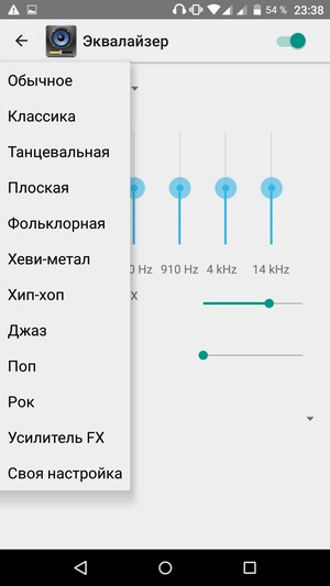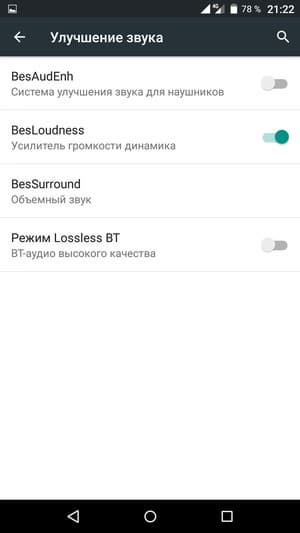 Для управления качеством звучания имеется возможность задействовать усилитель громкости динамика BesLoudness и улучшитель звука для наушников BesAudEnh. Для воспроизведения мелодий в смартфоне используется штатный аудиоплеер Google с возможностью выбора из нескольких предустановленных значений эквалайзера.