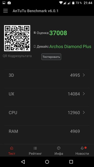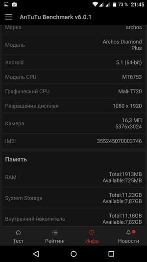 Аккумуляторная батарея, установленная в Archos Diamond Plus, имеет вполне достойную для современных смартфонов емкость в 2850 мА·ч. Соответственно, ничто не помешало герою обзора продемонстрировать довольно неплохой уровень автономности. Аппарат уверенно проявил себя во всех стандартных тестах, никаких заметных провалов не выявлено. Обошлось без рекордов, но испытуемый в любом случае демонстрирует во всех тестах время автономной работы выше среднего уровня, с этим у данного аппарата проблем точно нет. При этом тестирование проводилось на обычном уровне энергопотребления, хотя в настройках можно задействовать и режим экономии энергии.