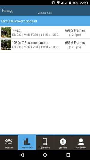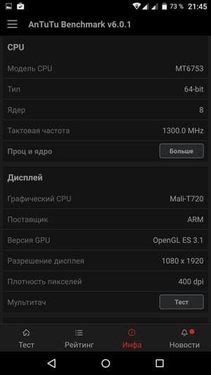 По результатам тестирования знакомая платформа ожидаемо показала результаты среднего уровня или даже чуть ниже. Например, в популярном бенчмарке AnTuTu герой обзора выдал около 37К очков, в то время как сегодняшние рекордсмены подобрались уже к цифрам 80-90К. В остальных тестах, как комплексных, так и специализированных, аппарат демонстрирует результаты абсолютно типичные для данной платформы, которая уже не раз оказывалась в нашей тестовой лаборатории. SoC МТ6753 заметно уступает своей более мощной сестре МТ6752, у которой частота тех же ядер CPU достигает 1,7 ГГц. Отличие имеется также и в видеоускорителе: вместо мощного Mali-T760 с частотой ядер до 700 МГц здесь используется трехъядерный Mali-T720 с частотой ядер до 450 МГц.