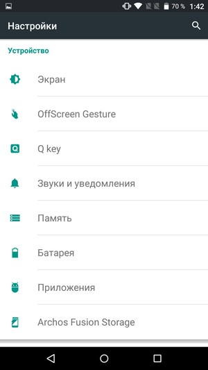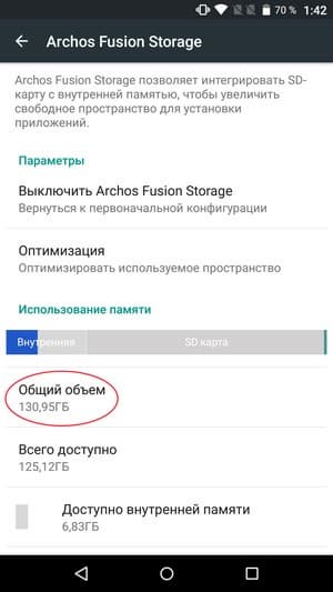 Но это еще не все. Самое необычное, что можно найти среди настроек Archos Diamond Plus — это функция интеграции памяти устанавливаемой карты microSD с внутренней памятью устройства так, что они становятся единым массивом. Такая функция носит название Archos Fusion Storage, и она здесь действительно работает. Причем, вопреки официальным предупреждениям о поддерживаемом максимальном объеме SD-карт до 32 ГБ, на деле аппарат без проблем поддерживает карты и объемом в 128 ГБ. При установке карты памяти смартфон самостоятельно перезагружается и после этого показывает в настройках уже «суммарный» объем памяти. В нашем случае получилось целых 130 ГБ, хотя собственной свободной памяти в устройстве изначально не более 8 ГБ.