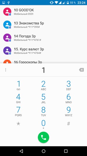 Телефонное приложение поддерживает Smart Dial, то есть во время набора телефонного номера сразу осуществляется и поиск по первым буквам в контактах. Поддержки ввода безотрывным методом Swype здесь нет.