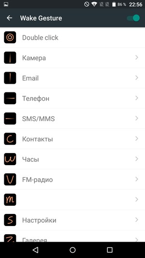 Яркость дисплея можно подстраивать вручную, а можно задействовать автоматическую регулировку. Технология мультитач здесь позволяет обрабатывать 5 одновременных прикосновений. При поднесении смартфона к уху экран блокируется с помощью датчика приближения. Экран можно разблокировать двойным постукиванием по стеклу, а также с помощью начертания разнообразных жестов с одновременным переходом к привязанным к жестам приложениям (например, к камере или музыкальному проигрывателю).