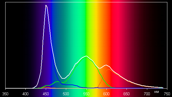 В итоге цвета имеют естественную насыщенность. Баланс оттенков на шкале серого очень компромиссный, так как цветовая температура сильно выше стандартных 6500 К, но хотя бы отклонение от спектра абсолютно черного тела (ΔE) меньше 10, что для потребительского устройства считается приемлемым показателем. При этом цветовая температура и ΔE мало изменяются от оттенка к оттенку — это положительно сказывается на визуальной оценке цветового баланса. (Самые темные области шкалы серого можно не учитывать, так как там баланс цветов не имеет большого значения, да и погрешность измерений цветовых характеристик на низкой яркости большая.)