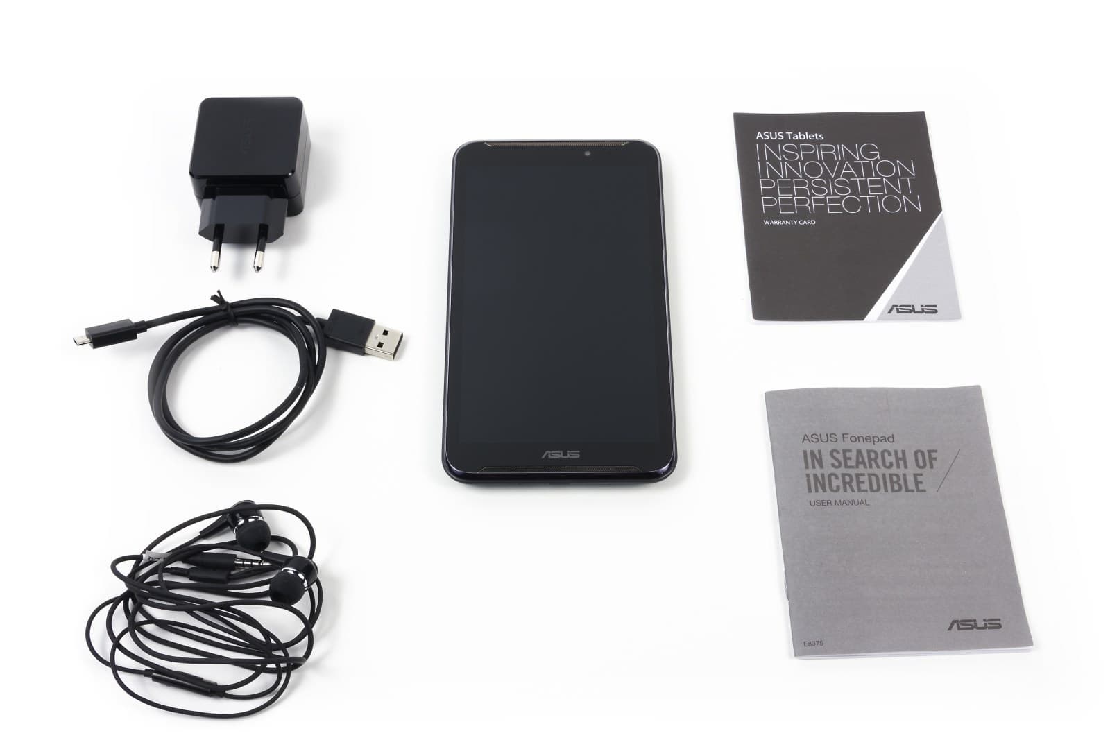 Комплектация Asus Fonepad Note 6 включает инструкцию с гарантийным буклетом, USB-кабель, проводную гарнитуру, а также сетевой адаптер.