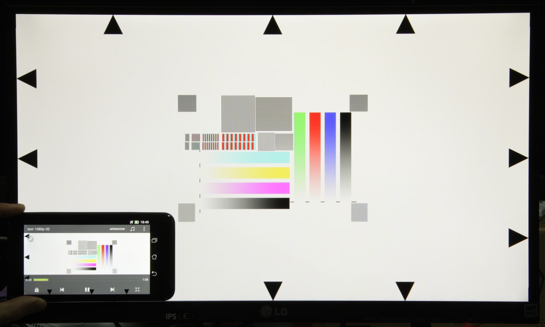 Далее с помощью набора тестовых файлов с перемещающейся на одно деление за кадр стрелкой и прямоугольником (см. «Методика тестирования устройств воспроизведения и отображения видеосигнала. Версия 1 (для мобильных устройств)») мы проверили, как видео выводится на экран самого смартфона. Снимки экрана с выдержкой в 1 с помогли определить характер вывода кадров видеофайлов с различными параметрами: варьировались разрешение (1280×720 (720p) и 1920×1080 (1080p) пикселей), а также частота кадров (24, 25, 30, 50 и 60 кадр/с). В тестах, если не указано иное, мы использовали видеоплеер MX Player в режиме «Аппаратный» (от «Аппаратный+» отличается только парой моментов, указанных ниже). Результаты этого (блок, озаглавленный как «Экран») и последующих тестов сведены в таблицу: