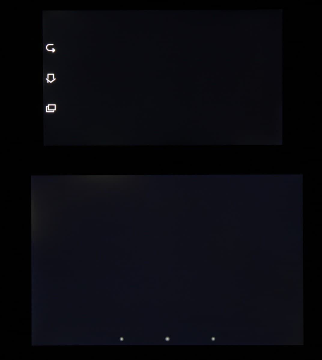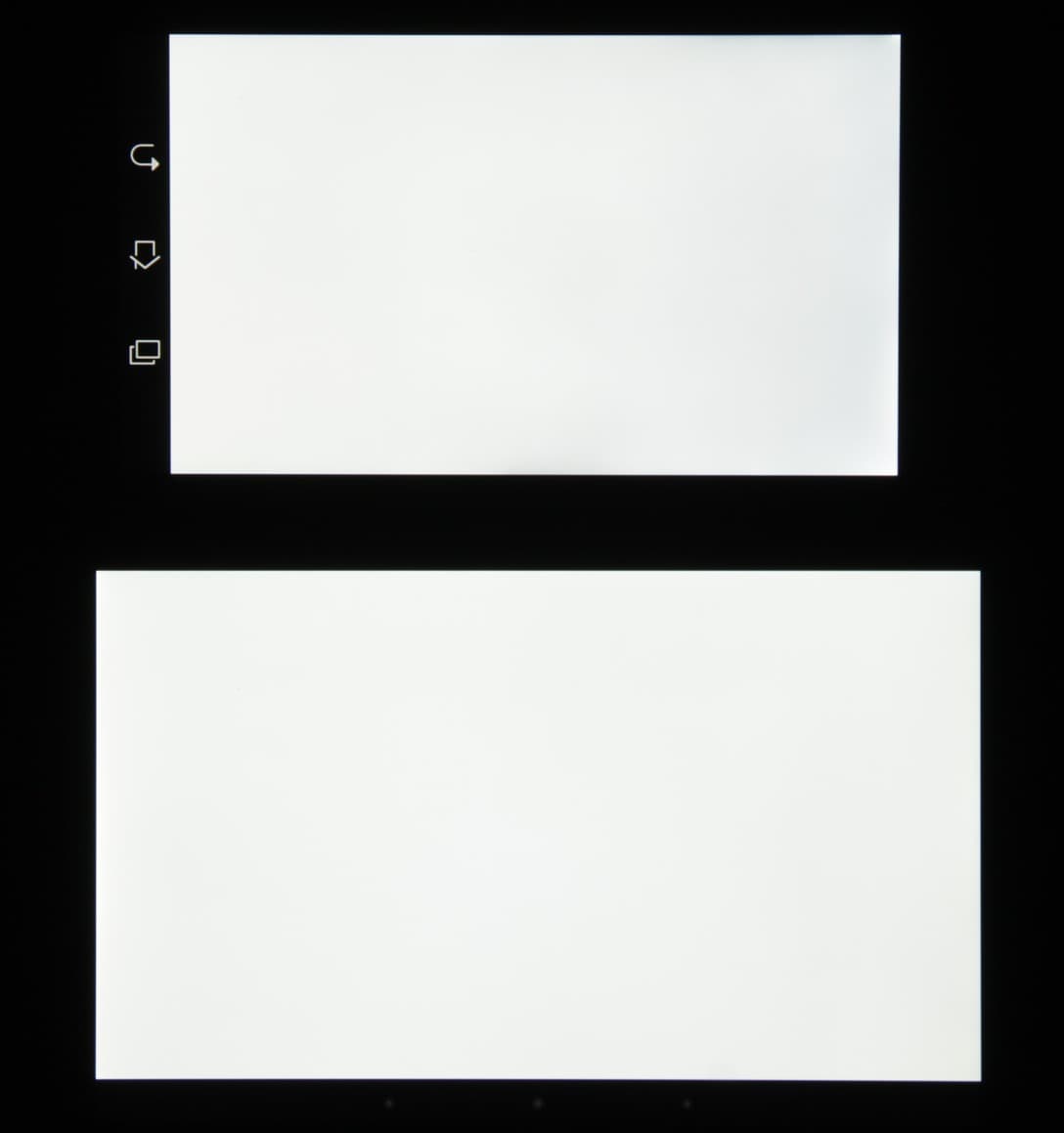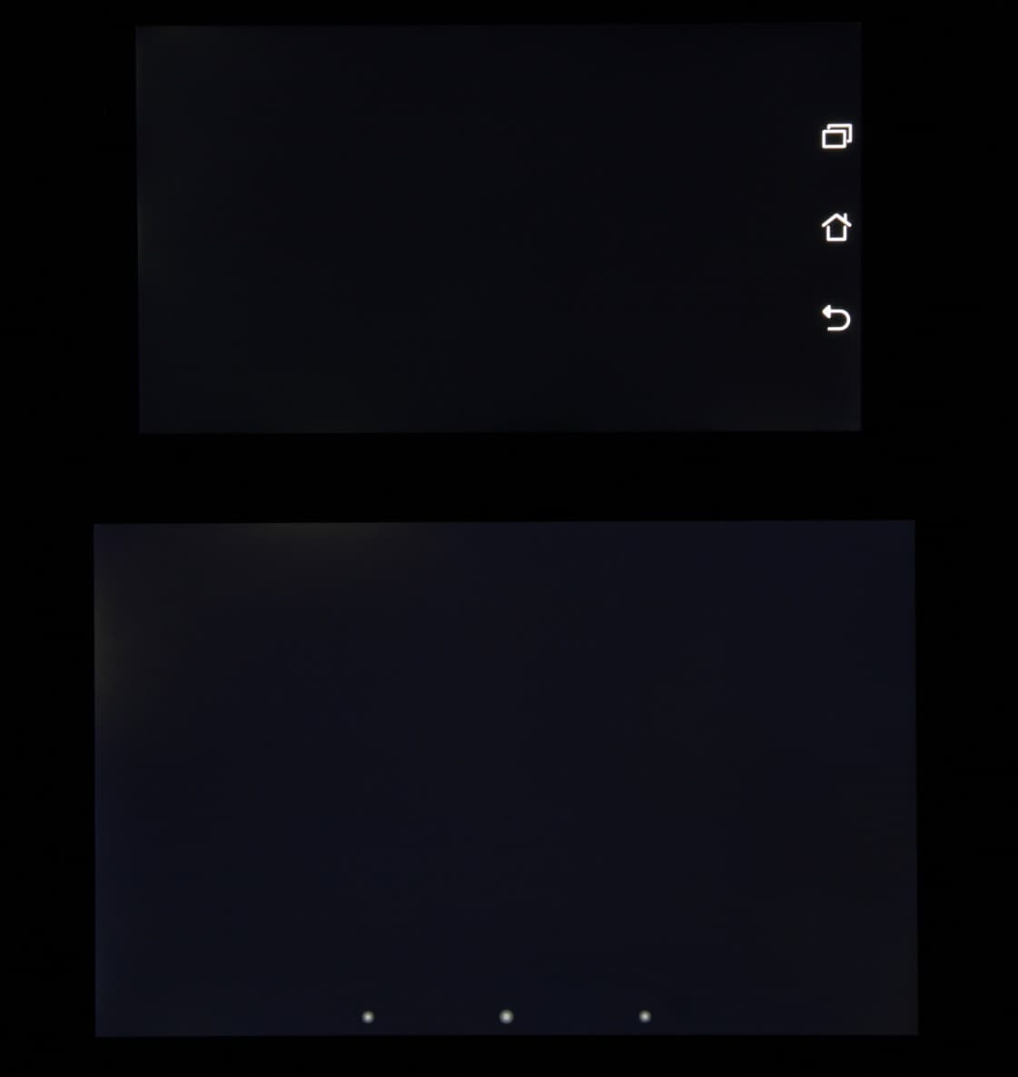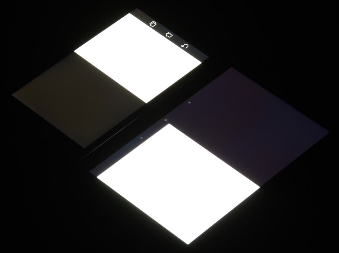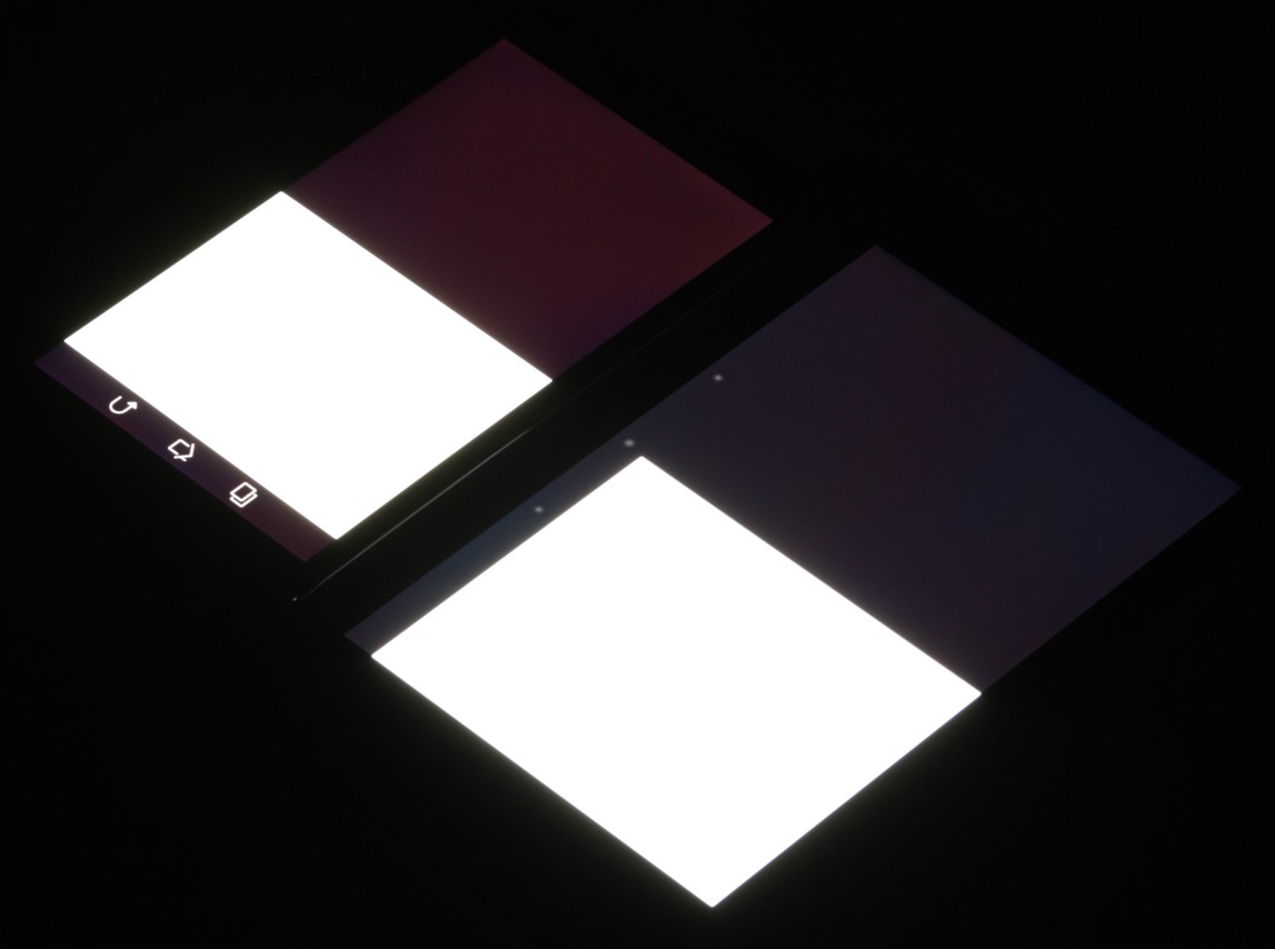 Черное поле при отклонении по диагонали высветляется совсем немного и приобретает красно-фиолетовый оттенок или остается практически нейтрально серым. Фотография с Nexus 7 для сравнения это показывает (яркость белых участков у обоих экранов одинаковая!):