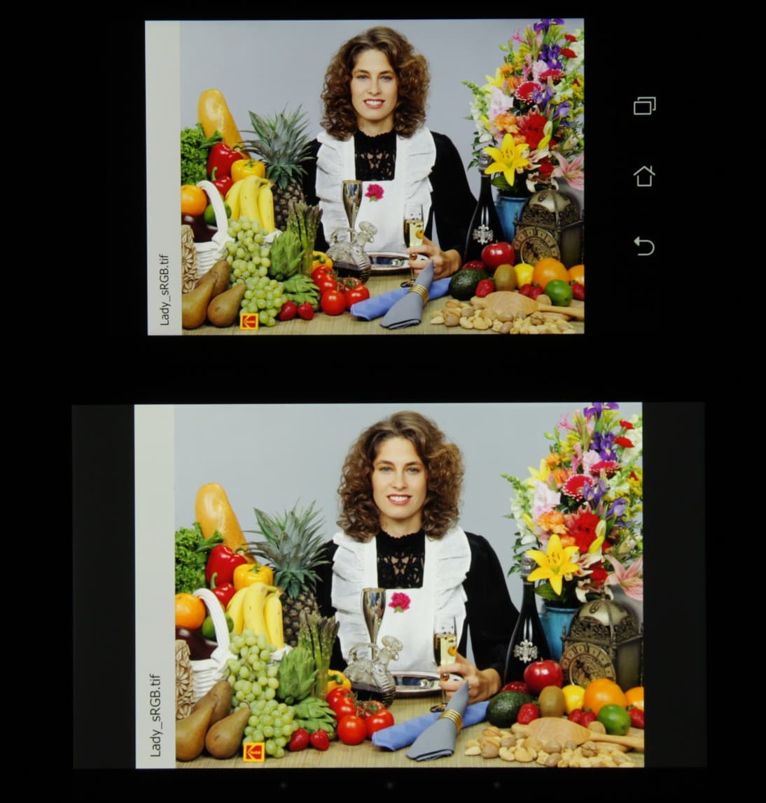 Видно, особенно по оттенкам кожи и серому фону, что цветопередача практически не различается, но картинка у Nexus 7 светлее, так как у Fonepad Note 6 яркость специально снижается в сравнении с выводом белого поля на весь экран. Теперь под углом примерно 45 градусов к плоскости и к стороне экрана: