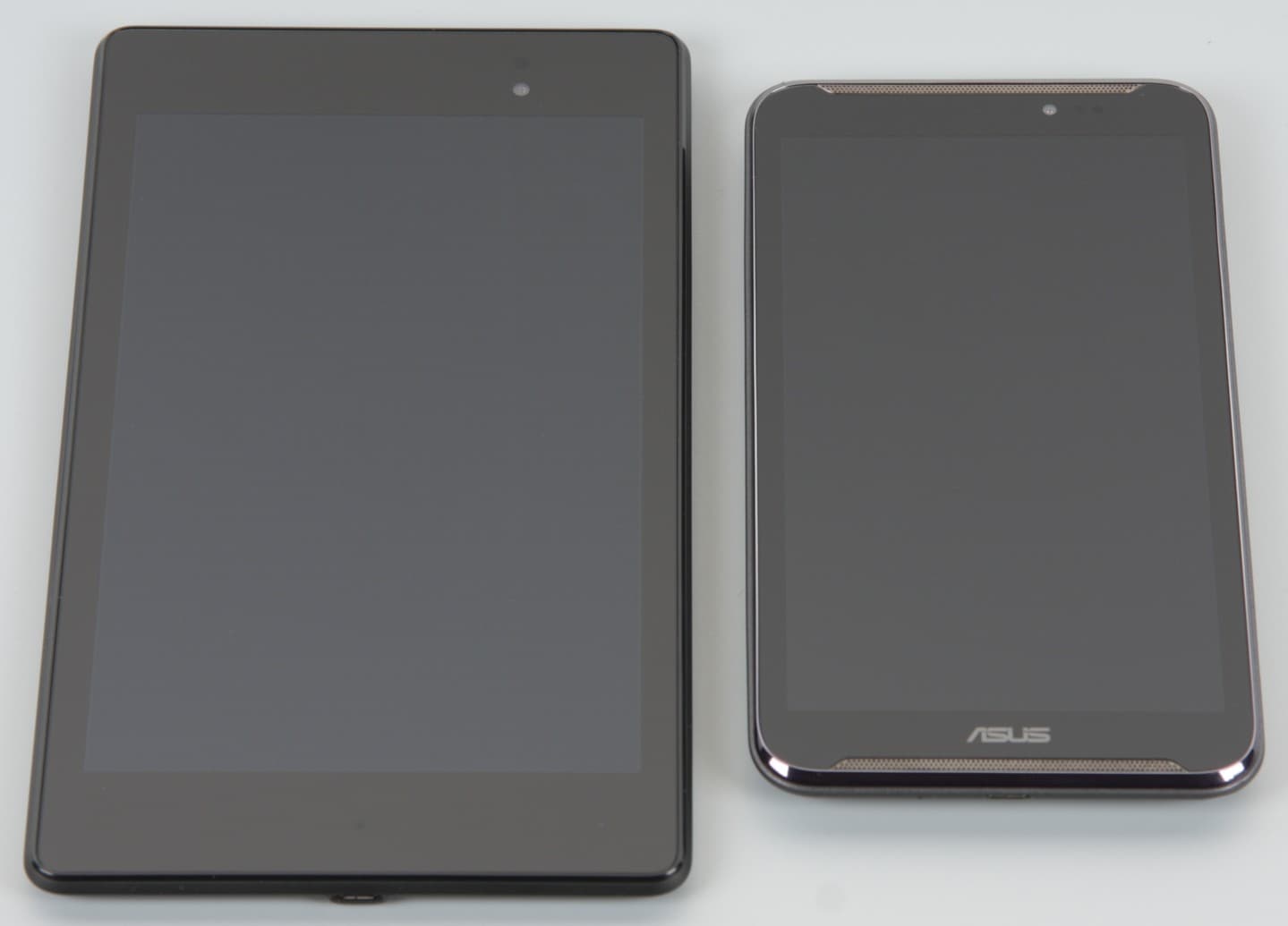 Лицевая поверхность экрана выполнена в виде стеклянной пластины с зеркально-гладкой поверхностью, устойчивой к появлению царапин. Судя по отражению объектов, имеется очень эффективный антибликовый фильтр, который по снижению яркости отражения лучше, чем у Google Nexus 7 (2013) (далее просто Nexus 7). Для наглядности приведем фотографию, на которой в выключенных экранах отражается белая поверхность (слева — Nexus 7, справа — Asus Fonepad Note 6, далее их можно различать по размеру):