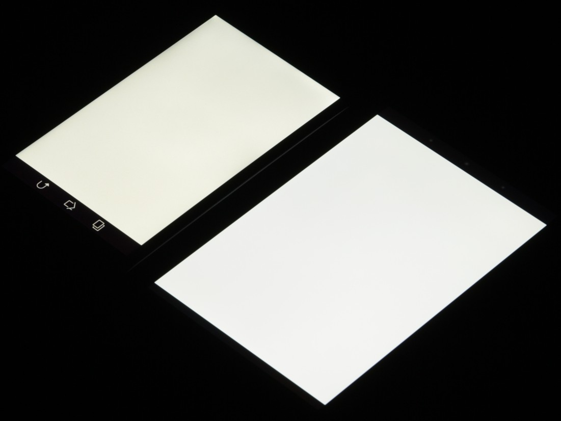 Экран имеет хорошие углы обзора без инвертирования оттенков и без значительного сдвига цветов даже при больших отклонениях взгляда от перпендикуляра к экрану. Для сравнения приведем фотографии, на которых на экраны Fonepad Note 6 и Nexus 7 выведены одинаковые изображения, при этом яркость обоих экранов установлена примерно на 200 кд/м². Перпендикулярно к экранам белое поле: