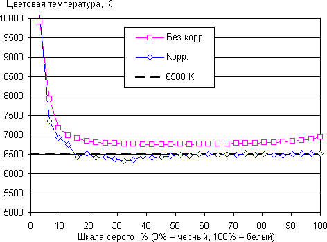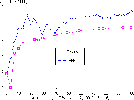 В итоге визуально цвета имеют естественную насыщенность. Баланс оттенков на шкале серого хороший, так как цветовая температура не сильно выше стандартных 6500 К, а отклонение от спектра абсолютно черного тела (ΔE) меньше 10, что для потребительского устройства считается хорошим показателем. При этом цветовая температура и ΔE мало изменяются от оттенка к оттенку — это положительно сказывается на визуальной оценке цветового баланса. (Самые темные области шкалы серого можно не учитывать, так как там баланс цветов не имеет большого значения, да и погрешность измерений цветовых характеристик на низкой яркости большая.)