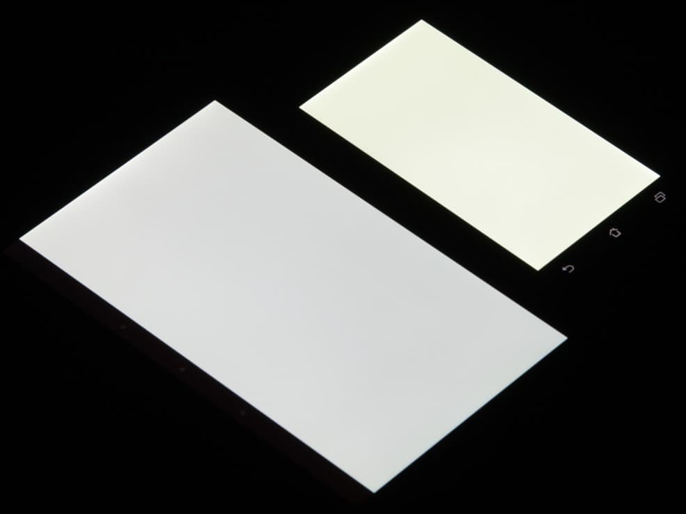 Экран имеет хорошие углы обзора без значительного сдвига цветов даже при больших отклонениях взгляда от перпендикуляра к экрану и без инвертирования оттенков. Для сравнения приведем фотографии, на которых на экраны Asus PadFone E и Nexus 7 выведены одинаковые изображения, при этом яркость экранов изначально установлена примерно на 200 кд/м² (по белому полю во весь экран), а цветовой баланс на фотоаппарате принудительно переключен на 6500 К. Перпендикулярно к экранам белое поле: