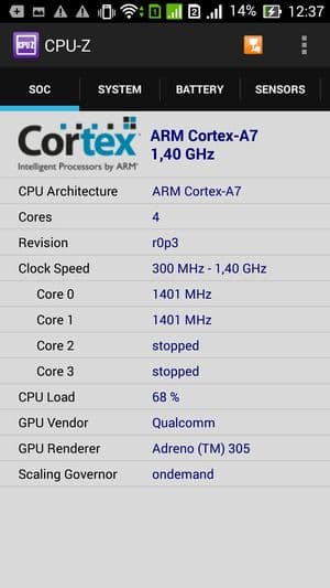 - SoC Qualcomm Snapdragon 400 (MSM8226), 1,4 ГГц, 4 ядра ARM Cortex-A7
