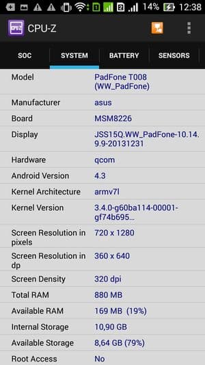 Аппаратная платформа Asus Padfone E строится на базе однокристальной системы (SoC) Qualcomm Snapdragon 400 (MSM8226). Центральный процессор здесь имеет 4 ядра ARM Cortex-A7, работающих на частоте 1,4 ГГц. Оперативной памяти в устройстве 1 ГБ, а хранилище, доступное пользователю для загрузки собственных файлов, составляет около 10 ГБ из номинально обозначенных 16 ГБ — остальное ушло на саму систему и приложения. Память можно нарастить за счет карточек microSD, а также можно подключить флэш-накопитель через OTG-переходник — аппарат данный режим поддерживает. Весьма импонирует, что тайваньцы не поскупились максимально оснастить свои недорогие смартфоны серии Padfone так же, как и флагманские — вплоть до поддержки работы с внешними устройствами (USB-host, OTG).