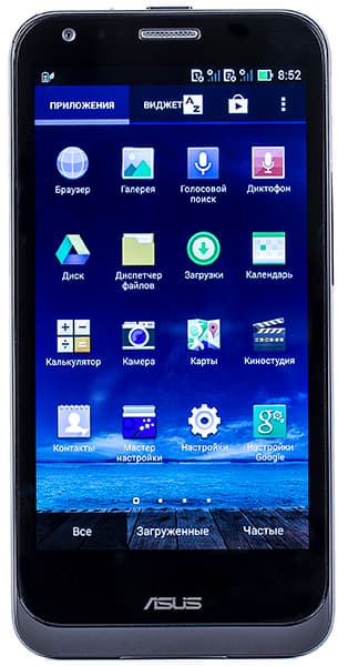 К звучанию динамиков Asus Padfone Е особых претензий нет. Звук достаточно громкий, и при этом он остается чистым во всем спектре частот. Голос знакомого собеседника, тембр и интонация остаются узнаваемыми, разговор вполне комфортен. Решетка для выхода звука здесь врезана в заднюю стенку, так что звук приглушается, когда аппарат лежит на столе.