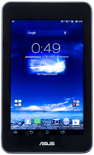 И напоследок расскажем о планшетном модуле Asus Padfone mini 4.3. Док-станция массой в 300 с небольшим граммов выполнена в едином стиле со смартфоном. Это такая же обтекаемая пласмассовая задняя часть с закругленными углами и покатыми боковинами и переднее плоское без бортиков стекло, под которым скрывается среднего качества семидюймовый дисплей с разрешением 1280×800 и плотностью точек 215 ppi.