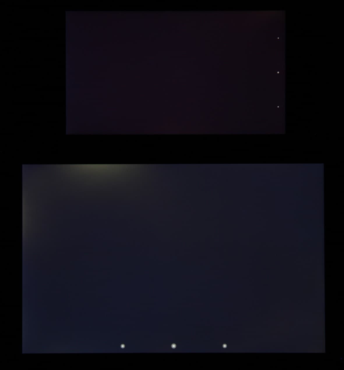 Яркость под углом у экранов уменьшилась (как минимум в 5 раз, исходя из разницы в выдержке), но в случае Asus Padfone S падение яркости чуть меньше. Черное поле при отклонении по диагонали высветляется слабо и приобретает фиолетовый или красно-фиолетовый оттенок. Фотографии ниже это демонстрируют (яркость белых участков в перпендикулярном плоскости экранов направлении примерно одинаковая!):