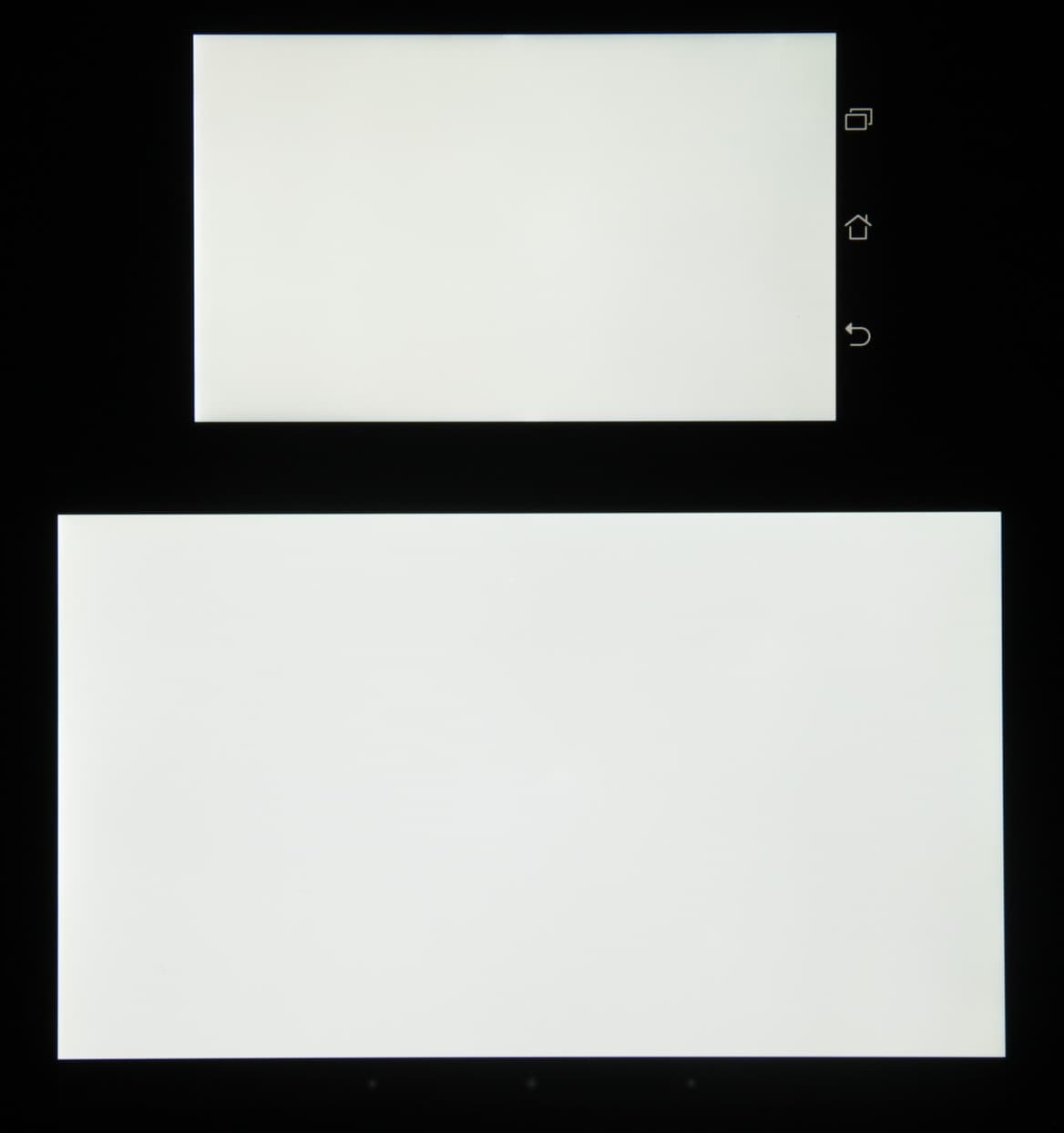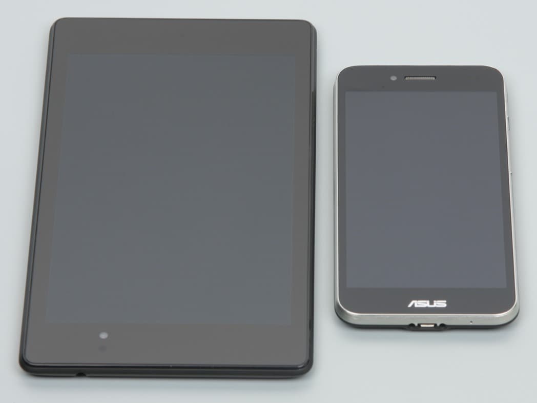 Лицевая поверхность экрана выполнена в виде стеклянной пластины с зеркально-гладкой поверхностью, устойчивой к появлению царапин. Судя по отражению объектов антибликовые свойства экрана не хуже, чем у экрана Google Nexus 7 (2013) (далее просто Nexus 7). Для наглядности приведем фотографию, на которой в выключенных экранах отражается белая поверхность (слева — Nexus 7, справа — Asus Padfone S, далее их можно различать по размеру):