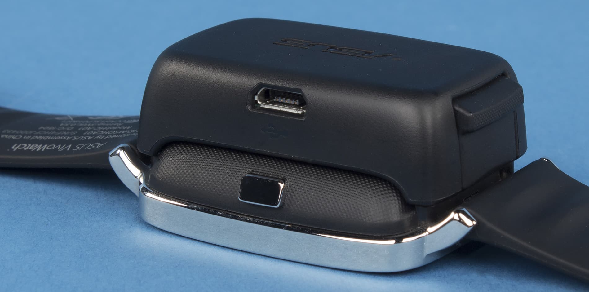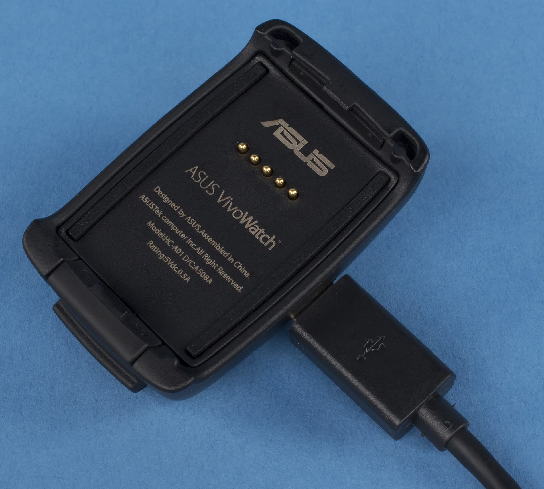 Крэдл цепляется на тыловую сторону устройства, как бы обхватывая его с коротких сторон, к крэдлу подсоединяется кабель. Заряжать часы можно от любого зарядного устройства для смартфонов.