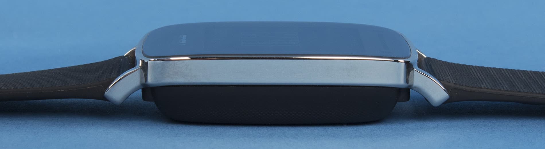 С другой стороны, в отличие от ZenWatch, ремешок здесь силиконовый, не особо красивый, тыльная сторона корпуса пластиковая, а в целом корпус толстоват: 11 мм против 7,9 мм у ZenWatch. Это, конечно, портит впечатление.