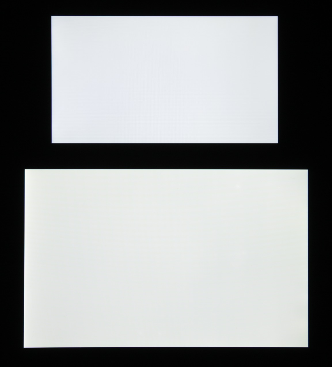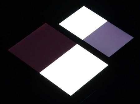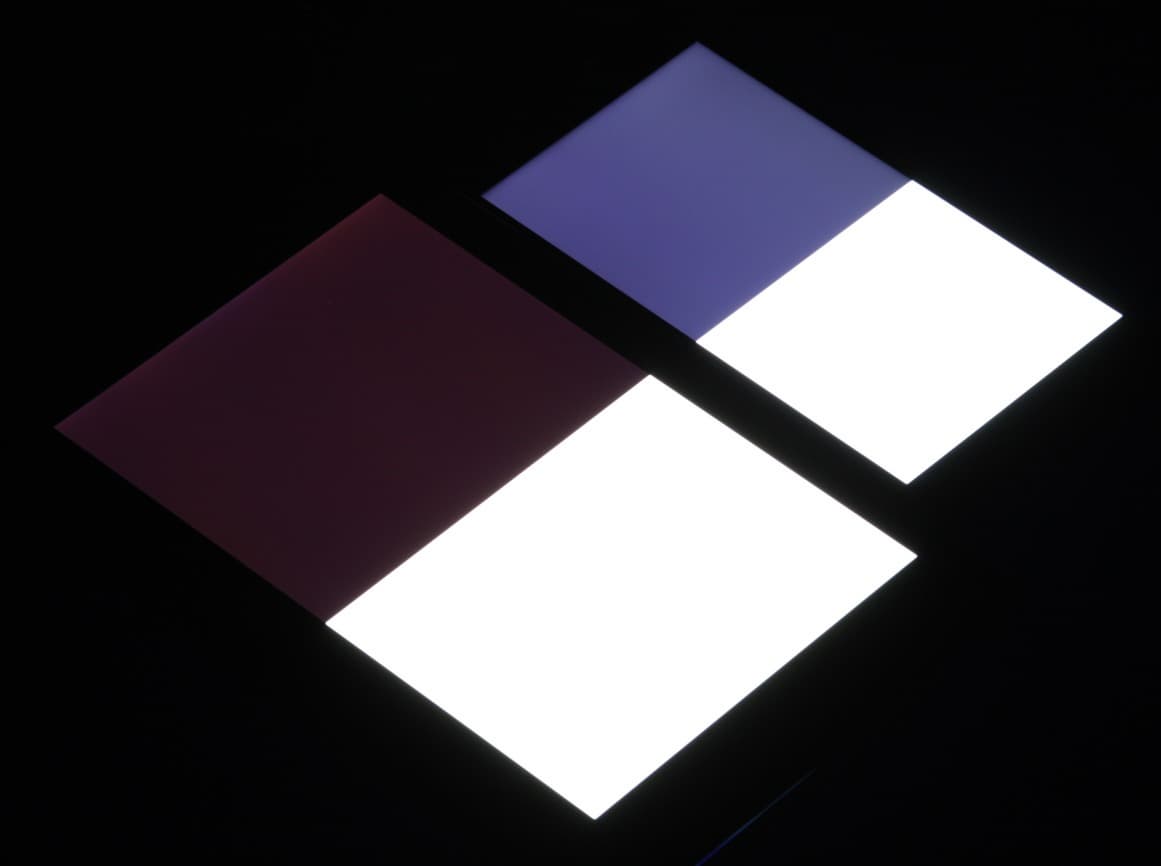 Яркость под углом у экранов уменьшилась (как минимум в 5 раз, исходя из разницы в выдержке), но у Asus Zenfone 4 Max снижение яркости чуть больше. Черное поле при отклонении по диагонали высветляется сильно и приобретает фиолетовый оттенок. Фотографии ниже это демонстрируют (яркость белых участков в перпендикулярном плоскости экранов направлении одинаковая!):