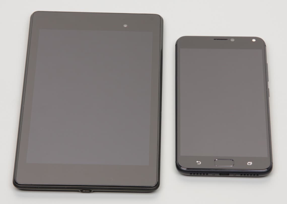 Лицевая поверхность экрана выполнена в виде стеклянной пластины с зеркально-гладкой поверхностью, устойчивой к появлению царапин. Судя по отражению объектов антибликовые свойства экрана не хуже, чем у экрана Google Nexus 7 (2013) (далее просто Nexus 7). Для наглядности приведем фотографию, на которой в выключенных экранах отражается белая поверхность (слева — Nexus 7, справа — Asus Zenfone 4 Max, далее их можно различать по размеру):