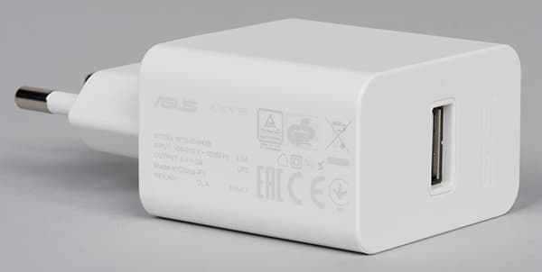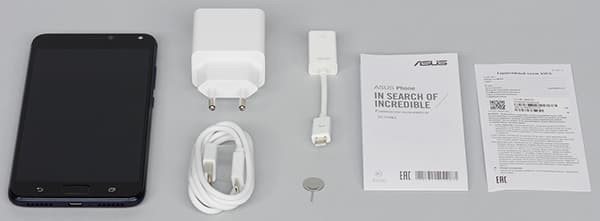 В коробке нашелся соединительный кабель, стандартный сетевой адаптер с выходным током и напряжением 5 В 2 А, ключик для извлечения карт. Комплектация точно такая же, как у Zenfone 3 Max. Здесь тоже в комплект не вложили проводную стереогарнитуру, но присутствует OTG-переходник. Это обусловлено тем, что Zenfone 4 Max поддерживает реверсную зарядку сторонних устройств от своего разъема Micro-USB.