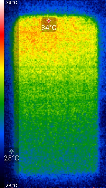 Нагрев больше локализован в верхней части аппарата, что, видимо, соответствует расположению микросхемы SoC. По данным теплокамеры, максимальный нагрев составил всего 34 градуса (при температуре окружающего воздуха в 24 градуса), это несущественный нагрев.