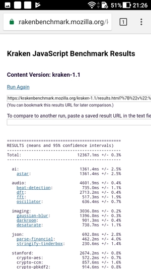 | Mozilla Kraken (мс, меньше — лучше) | 12367 | 11432 | 9992 | 9587 | 8179 |