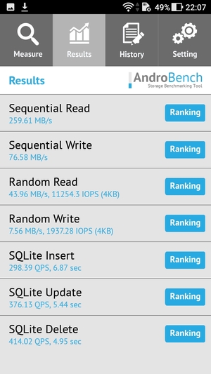 Результаты теста AndroBench на скорость работы с памятью: