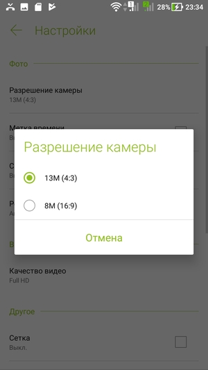 Среди настроек присутствует автоматический режим с функцией расширенного динамического диапазона и возможностью съемки в условиях плохой освещенности, профессиональный режим, режим улучшения портрета, режим суперразрешения, GIF-анимация, панорамная съемка, селфи-панорама, замедленная съемка. В режиме суперразрешения программа склеивает четыре снимка по 13 Мп, делая одно большое изображение 52 Мп (8320×6240). На фирменном сайте почему-то указано разрешение 64 Мп, это ошибка.