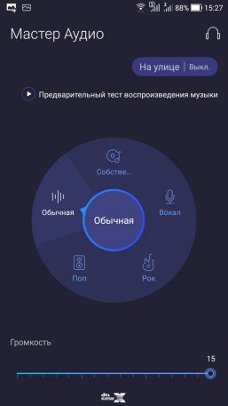 Для прослушивания музыки используется штатный плеер Google Music, для настройки параметров аудиосистемы служит знакомое приложение AudioWizard. Стереоэффекта, как в центральной модели Asus Zenfone 4, тут не создается, всегда работает только один динамик. Тем не менее, особых претензий к звуку нет: громкоговоритель звучит чисто, запас громкости достаточен. В наушниках звук тоже яркий, чистый и насыщенный, запас громкости велик. Более того, при подключенных наушниках используется технология пространственного звучания DTS Headphone:X.