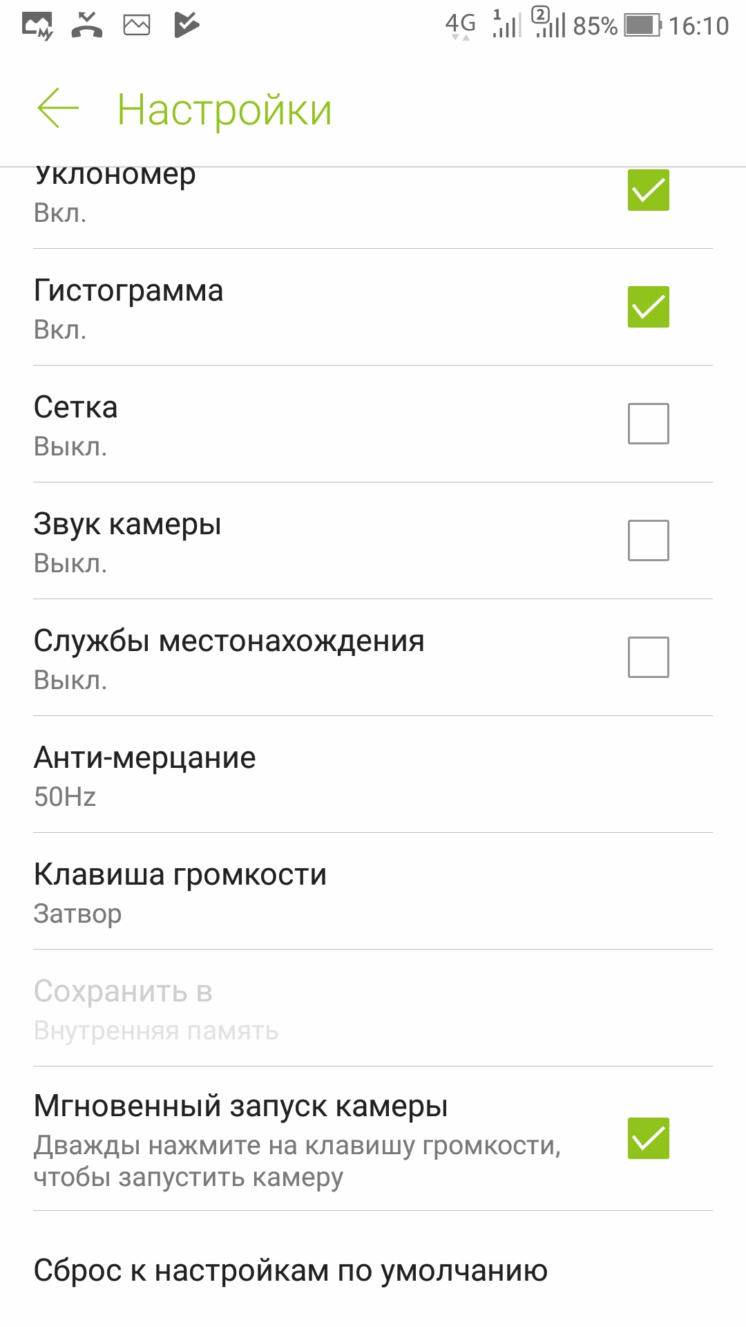 В роли тыльной камеры (в случае этого аппарата вряд ли можно уверенно говорить об основной камере) используется одиночный модуль с разрешением сенсора 16 Мп и объективом с диафрагмой f/2,2 и углом обзора 80°. У него есть уже и стабилизация изображения, и система фазовой автофокусировки. Меню стандартно для интерфейса ZenUI 4.0, оно богато на настройки. Есть и ручной режим Pro, в котором можно найти шкалу экспокоррекции, настроить баланс белого, выставить светочувствительность до ISO 3200. Присутствует штатная возможность сохранения снимков в RAW.