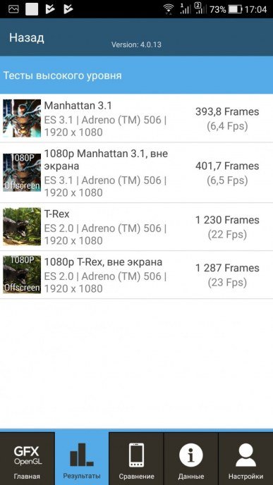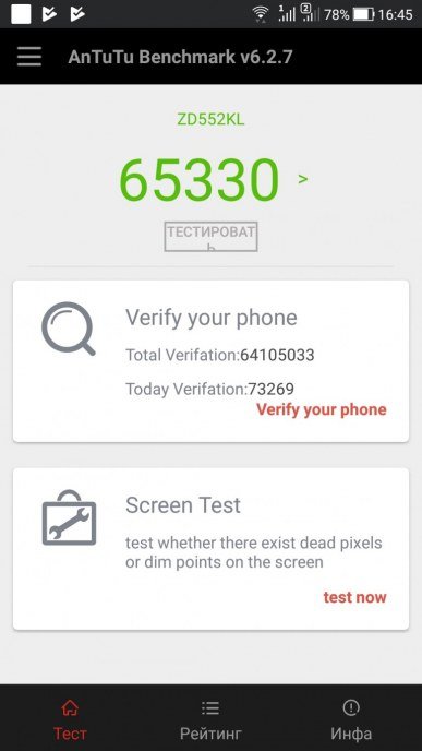И тем не менее, данная SoC все еще способна поддерживать современный смартфон на актуальном уровне, в тесте AnTuTu герой обзора набирает свои 65К очков. С данной платформой смартфон демонстрирует вполне уверенное быстродействие и в реальных сценариях работы, и в играх. Все проверенные нами игры, включая Modern Combat 5 и Mortal Kombat X, идут без малейших притормаживаний. Однако заметного запаса мощи для будущих обновлений у такой модели нет.