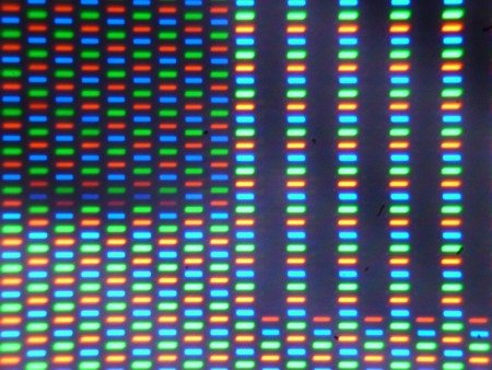 В этом экране используется матрица AMOLED — активная матрица на органических светодиодах. Полноцветное изображение создается с помощью субпикселей трех цветов — красного (R), зеленого (G) и синего (B) в равном количестве. Это подтверждается фрагментом микрофотографии: