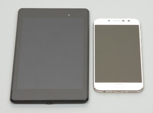 Лицевая поверхность экрана выполнена в виде стеклянной пластины с зеркально-гладкой поверхностью, устойчивой к появлению царапин. Судя по отражению объектов, антибликовые свойства экрана не хуже, чем у экрана Google Nexus 7 (2013) (ниже просто Nexus 7). Для наглядности приведем фотографию, на которой в выключенных экранах отражается белая поверхность (слева — Nexus 7, справа — Asus ZenFone 4 Selfie Pro, далее их можно различать по размеру):