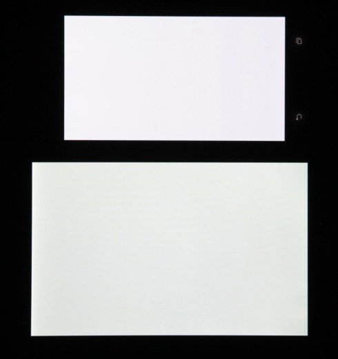 Экран характеризуется великолепными углами обзора. Правда, белый цвет при отклонении даже на небольшие углы приобретает легкий синеватый оттенок, но черный цвет остается просто черным под любыми углами. Он настолько черный, что параметр контрастности в данном случае просто неприменим. Для сравнения приведем фотографии, на которых на экраны Asus ZenFone 4 Selfie Pro и второго участника сравнения выведены одинаковые изображения, при этом яркость экранов изначально установлена примерно на 200 кд/м², а цветовой баланс на фотоаппарате принудительно переключен на 6500 К.