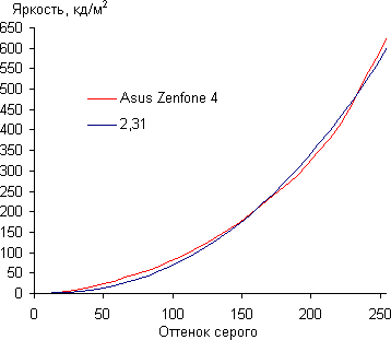 Контрастность (примерно в центре экрана) высокая — порядка 1300:1. Время отклика при переходе черный-белый-черный равно 30 мс (17 мс вкл. + 13 мс выкл.). Переход между полутонами серого 25% и 75% (по численному значению цвета) и обратно в сумме занимает 41 мс. Построенная по 32 точкам с равным интервалом по численному значению оттенка серого гамма-кривая не выявила завала ни в светах, ни в тенях. Показатель аппроксимирующей степенной функции равен 2,31, что выше стандартного значения 2,2, потому и изображение чуть затемнено. При этом реальная гамма-кривая немного отклоняется от степенной зависимости: