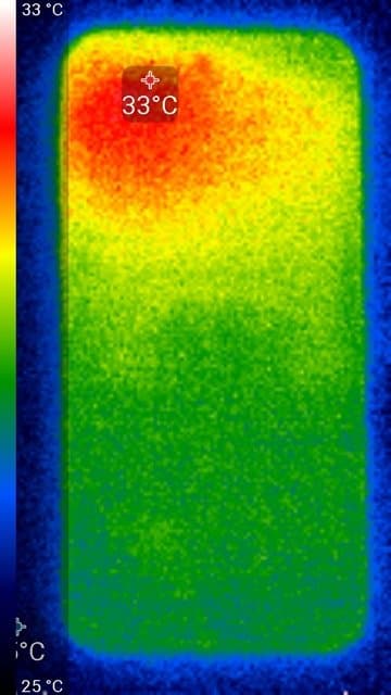 Нагрев больше локализован в верхней правой части аппарата, что, видимо, соответствует расположению микросхемы SoC. По данным теплокамеры, максимальный нагрев составил всего 33 градуса (при температуре окружающего воздуха в 24 градуса), это относительно немного.