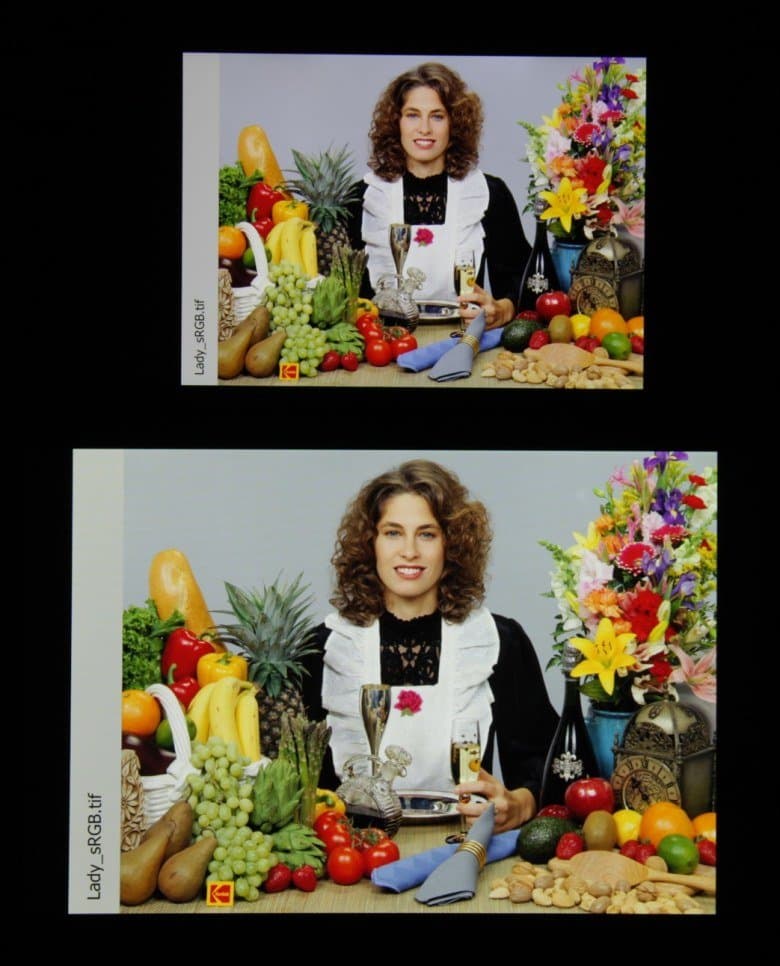 В итоге цвета имеют естественную насыщенность и оттенок. По умолчанию баланс оттенков на шкале серого хороший, так как цветовая температура хоть и заметно выше стандартных 6500 К, но отклонение от спектра абсолютно черного тела (ΔE) ниже 10, что для потребительского устройства считается приемлемым показателем. При этом оба параметра не очень сильно изменяются от оттенка к оттенку — это положительно сказывается на визуальной оценке цветового баланса. (Самые темные области шкалы серого можно не учитывать, так как там баланс цветов не имеет большого значения, да и погрешность измерений цветовых характеристик на низкой яркости большая.)
