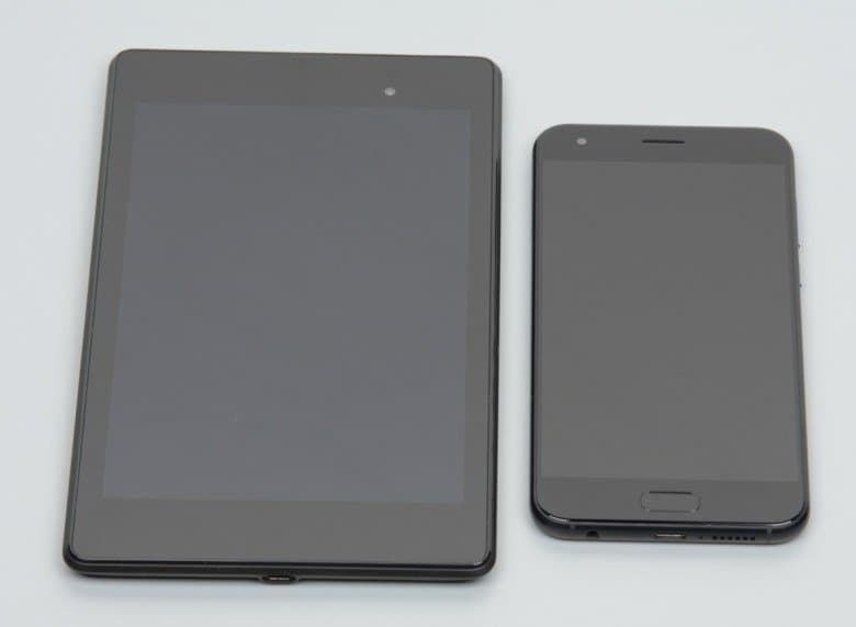 Лицевая поверхность экрана выполнена в виде стеклянной пластины с зеркально-гладкой поверхностью, устойчивой к появлению царапин. Судя по отражению объектов, антибликовые свойства экрана не хуже, чем у экрана Google Nexus 7 (2013) (далее просто Nexus 7). Для наглядности приведем фотографию, на которой в выключенных экранах отражается белая поверхность (слева — Nexus 7, справа — Asus Zenfone 4, далее их можно различать по размеру):