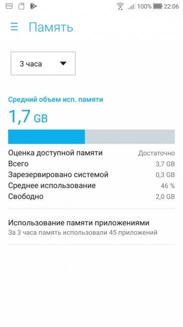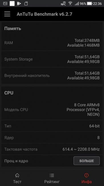 Объем оперативной памяти составляет 4 или 6 ГБ (это еще по два возможных варианта для каждой из двух модификаций, от установленной SoC объем памяти не зависит), а встроенной флэш-памяти — всегда 64 ГБ. Из них в среднем свободно около 51 ГБ флэш-памяти и 2 (из 4) ГБ ОЗУ.