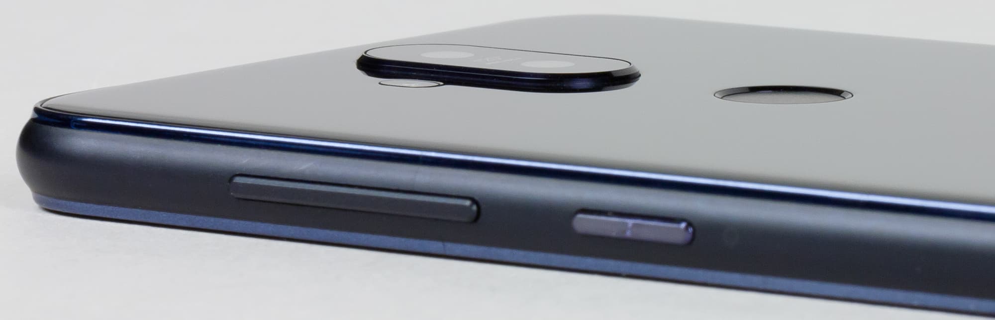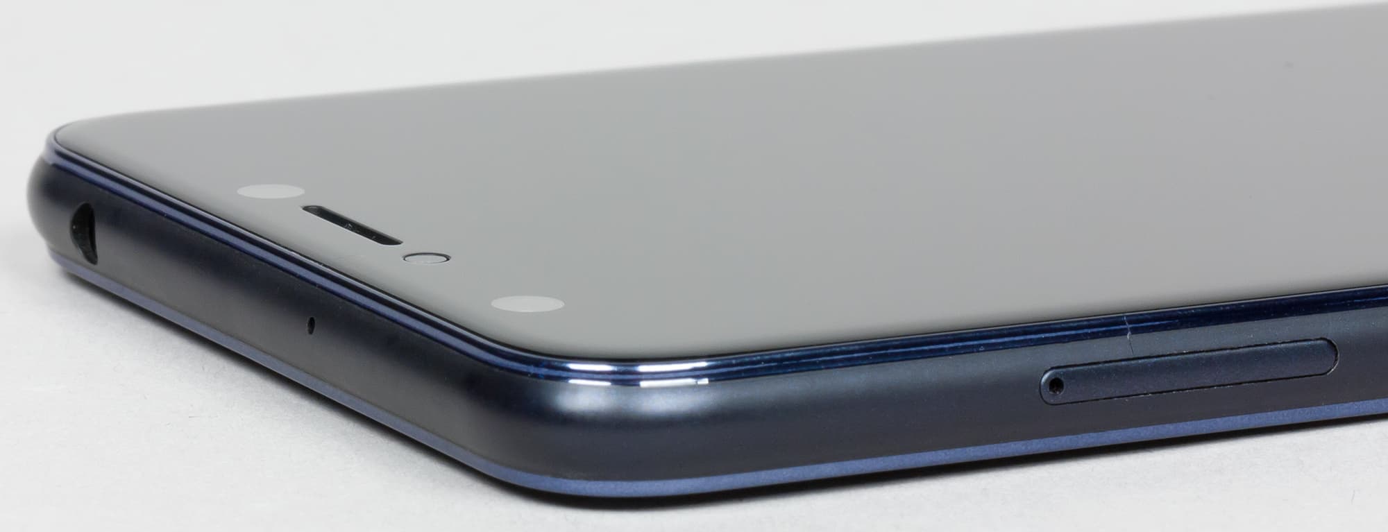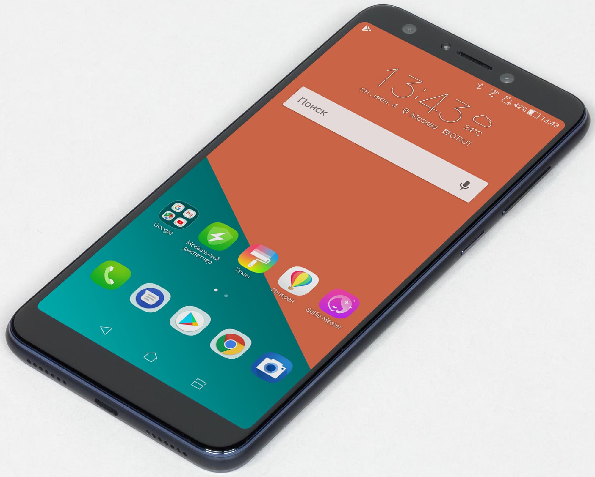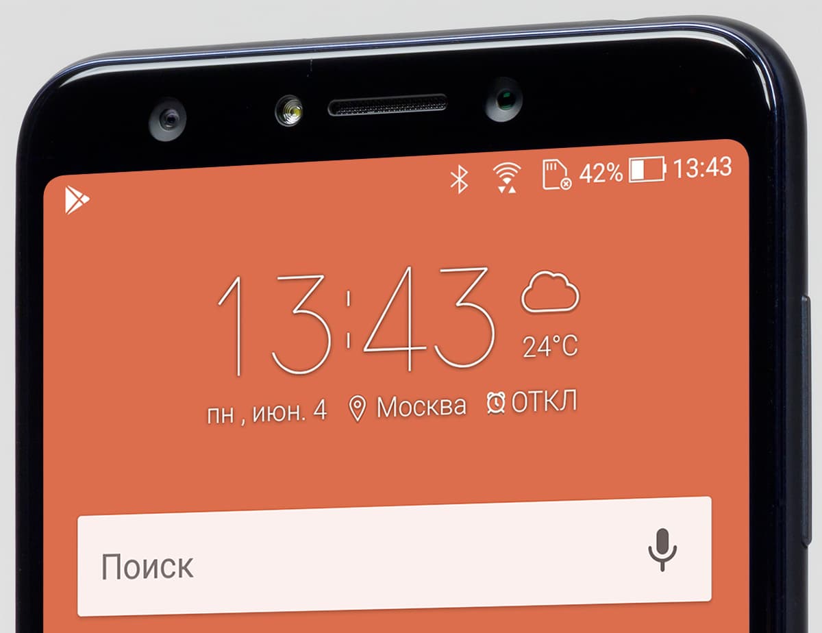 Фронтальная поверхность еще более монолитна, хотя, как мы уже отмечали, полоски снизу и сверху экрана не позволяют забыть, что перед нами все-таки не флагман. Нижняя полоска лишена какой-либо функциональности, а на верхней равномерно располагаются две фронтальные камеры, вспышка и разговорный динамик. Те наши читатели, которые возмущаются «монобровью» у iPhone X, Asus Zenfone 5 и других новинок, должны быть этим консервативным решением довольны :)