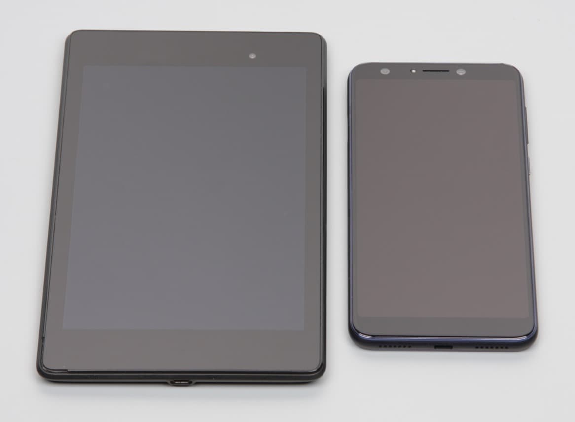 Лицевая поверхность экрана выполнена в виде стеклянной пластины с зеркально-гладкой поверхностью, устойчивой к появлению царапин. Судя по отражению объектов, антибликовые свойства экрана не хуже, чем у экрана Google Nexus 7 (2013) (далее просто Nexus 7). Для наглядности приведем фотографию, на которой в выключенных экранах отражается белая поверхность (слева — Nexus 7, справа — Asus ZenFone 5 Lite, далее их можно различать по размеру):