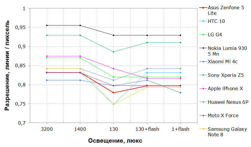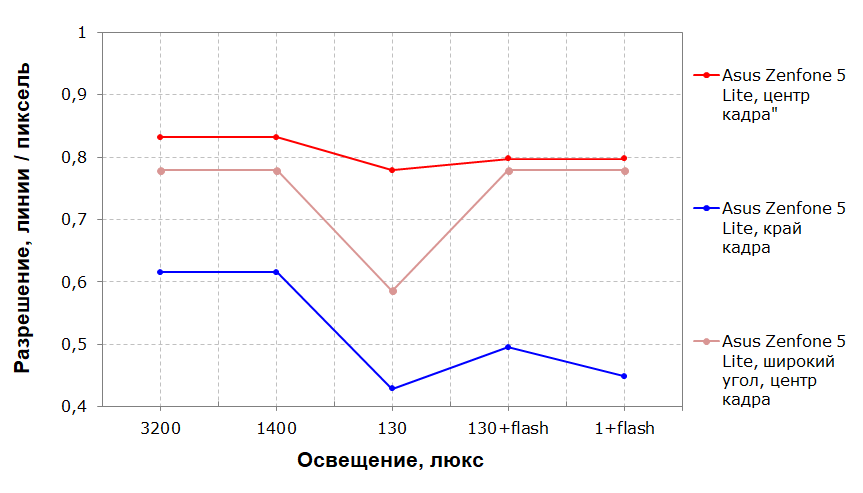 Лабораторный тест демонстрирует ту самую разницу в детализации между Zenfone 5 и Zenfone 5 Lite. По графикам видно, что в центре разрешение проседает не очень сильно, а вот разрешение на краю кадра заметно упало. Тем не менее, разрешение в целом по-прежнему высокое.